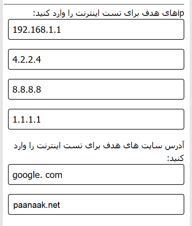 در بخش تست اتصال اینترنت میتوانید حداکثر ۴ آیپی و ۲ آدرس اینترنتی را به مانند تصویر زیر وارد نمایید تا دستگاه اتصال اینترنت را به وسیله آنها تست نماید.